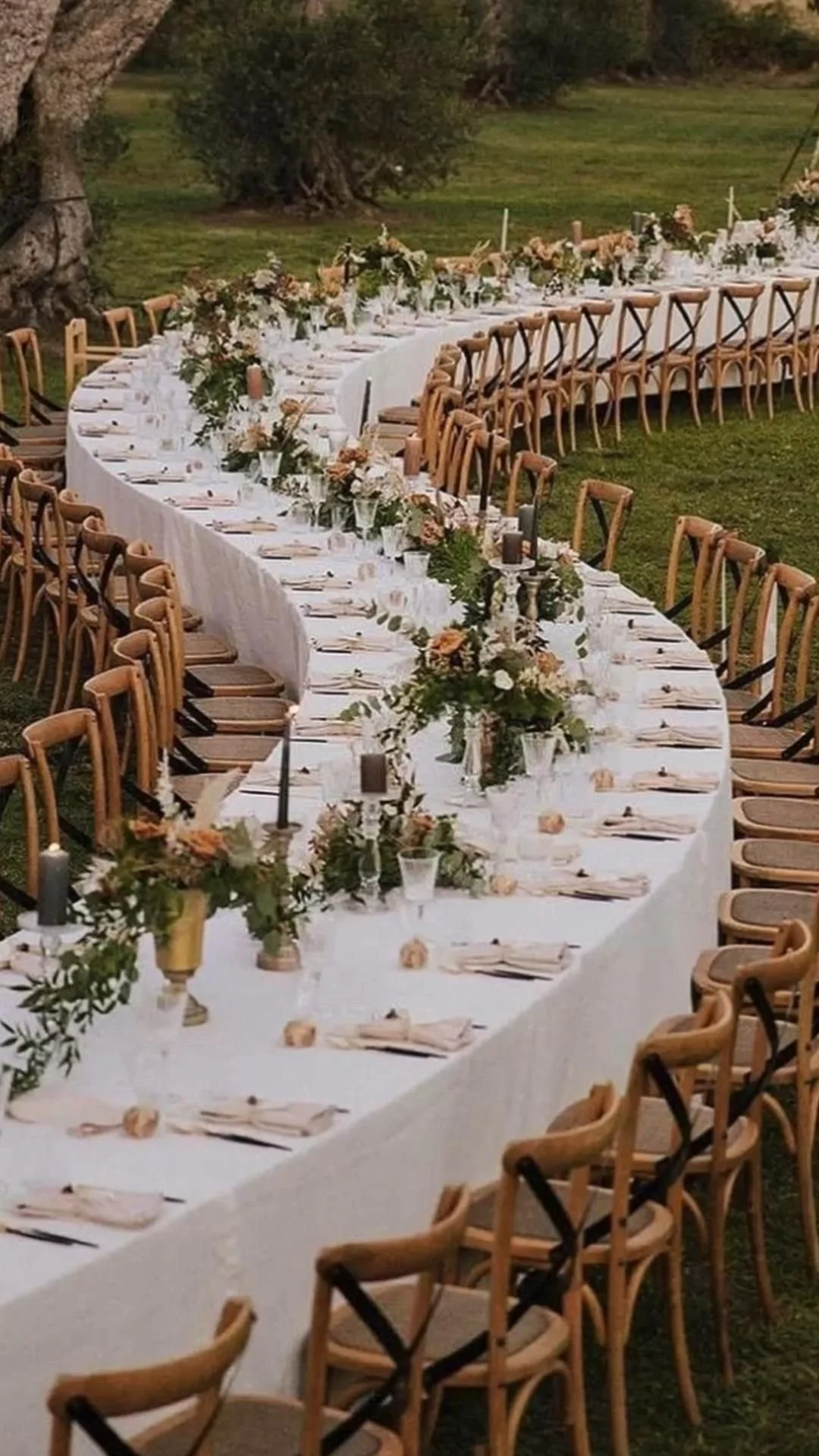 Curving table, wood chairs, table linens and napkins
